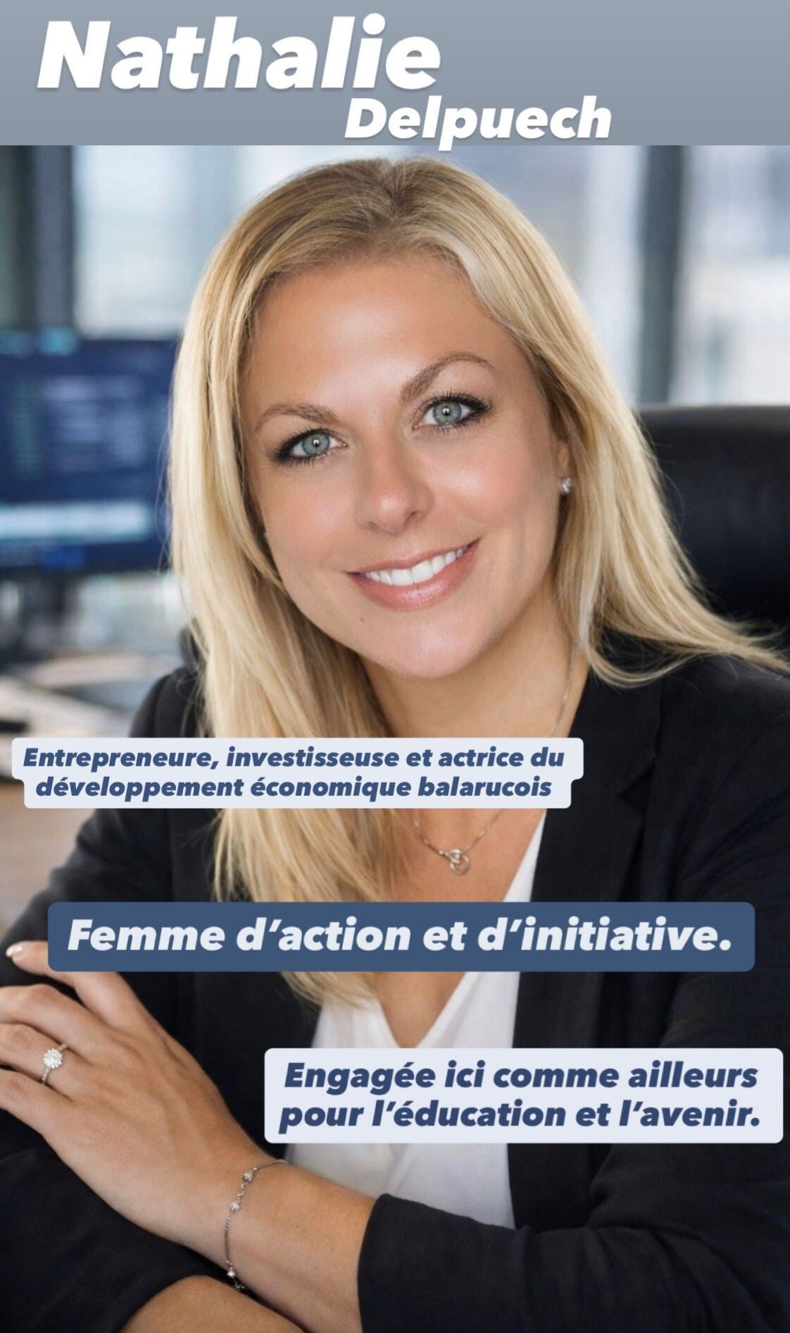 Attachée à Balaruc-les-Bains, à son identité thermale et à son potentiel économique, Nathalie Delpuech souhaite aujourd’hui mettre son EXPÉRIENCE d’entrepreneure, son sens de l’INITIATIVE et son ENGAGEMENT HUMAIN au service d’un PROJET COLLECTIF pour la commune.